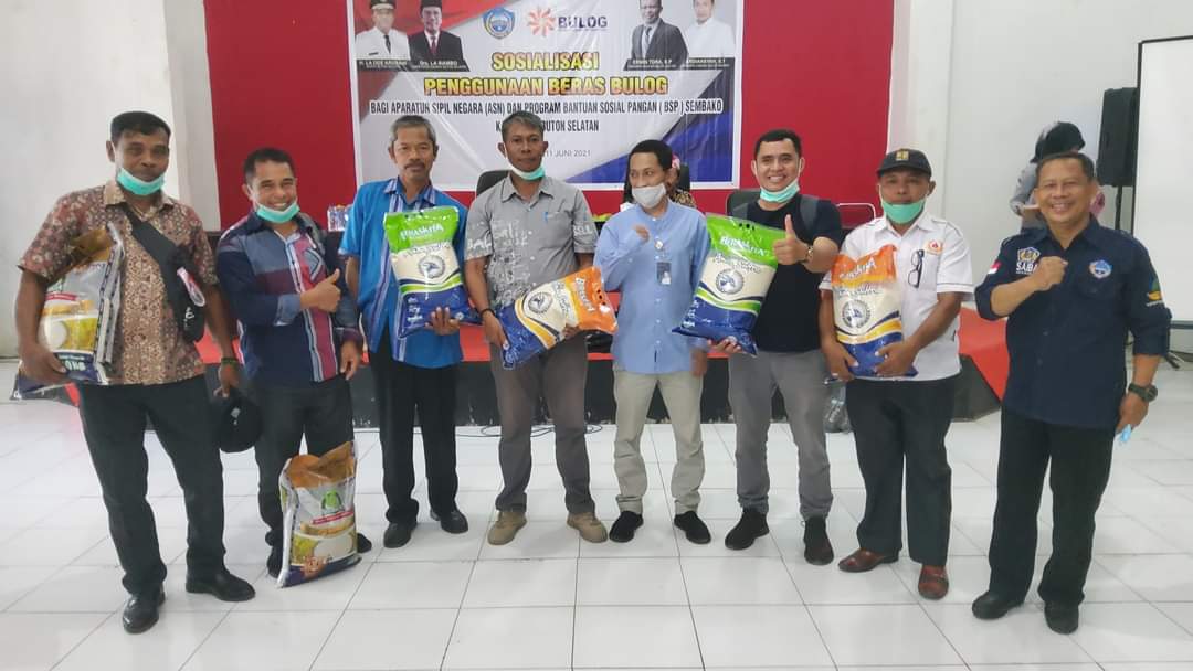 BUSEL, TP – Pemerintah Kabupaten Buton Selatan bersama Bulog Cabang Baubau melakukan sosialisasi pengunaan beras Bulog bagi ASN dan Program Bantuan Sosial Pangan (BSP) Sembako. Jumat (11/6/2021).