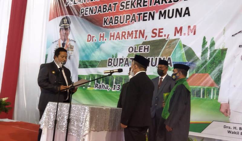 MUNA, TP – Bupati Muna LM Rusman Emba melantik Harimin sebagai Penjabat (Pj) Sekda Muna, di Gedung Sarana Olahraga (SOR) Laode Pandu, pada Senin, (13/9/2021).