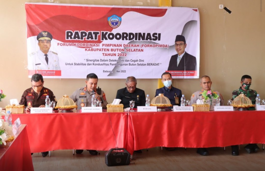 BUSEL, TRIASPOLITIKA.ID – Dalam rangka menjaga dan mengantisipasi gangguan Keamanan Ketertiban Masyarakat (Kamtibmas) di Kabupaten Buton Selatan, Forum Koordinasi Pimpinan Daerah Kabupaten Buton menyelenggarakan Rapat Koordinasi (Rakor) yang bertempat di Pondok Bambu Buton Selatan, Selasa (10/5/2022).