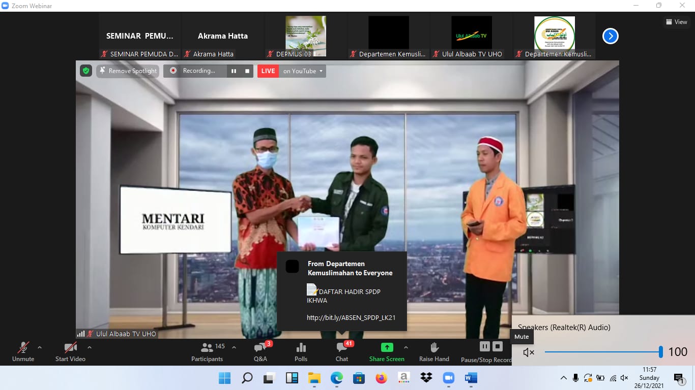 KENDARI, TRIASPOLITIKA. ID – Lembaga Dakwah Kampus (LDK) Ulul Albaab Universitas Halu Oleo (UHO) menggelar seminar Pemuda dan Peradaban. Kegiatan yang diikuti oleh 312 mahasiswa UHO dengan mengusung tema “Eksistensi Pemuda dalam Merefleksikan Kemenangan”, dilaksanakan secara virtual via Zoom Cloud Meeting pada Ahad (26/12/2021).