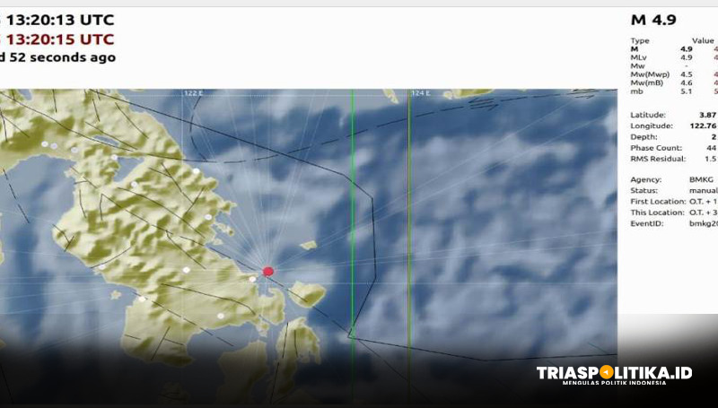 Gempa terjadi pada pukul 21.20 WITA dengan keadalaman 2 kilometer. “Info Gempa Mag:4.9 SR, 25-Mar-2022 21:20:13 WITA, Lok:3.87 LS, 122.76 BT(11.9 km TimurLaut Soropia, Kab. Konawe – SULTRA), Kedlmn: 2 km ::BMKG-KDI,” tulis BMKG dalam rilis awalnya.