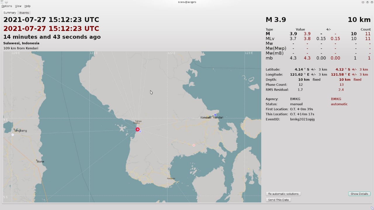 Dari keterangan BMKG, Gempa bumi magnitudo 3,9 SR pada 27 Juli pukul 23.12. WITA, dengan episenter pada koordinat 4.14 Lintang Selatan (LS) dan 121.62 Bujur Timur (BT) atau 4.1 km Timur Laut Pomalaa, Kabupaten Kolaka dengan kedalaman 10 km tersebut, getarannya mengagetkan sebagian warga Kolaka dan Kolaka Timur.