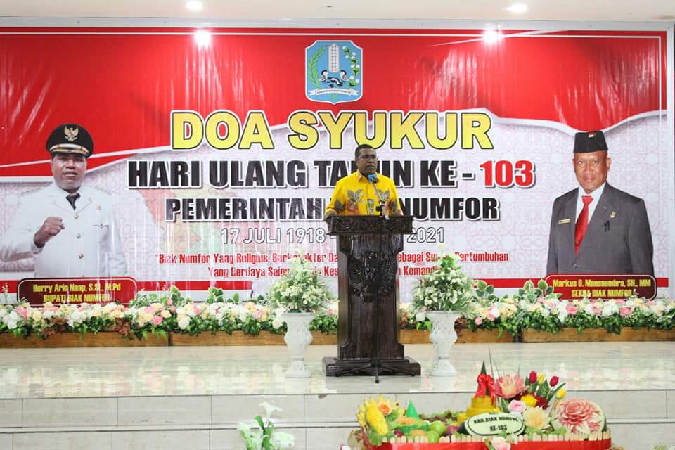 BIAK, TP – Peringatan Hari Jadi Pemerintah Kabupaten Biak Numfor yang ke-103, Sabtu (17/7/2021) tidak dilakukan seperti biasanya akibat dari pandemic Covid-19. Doa syukur hanya ditandai dengan pemotongan tumpeng oleh Bupati Herry Ario Naap, S.Si.,MPd dan dihadiri jajaran pejabat eselon II, di Gedung Darma Wanita Biak.