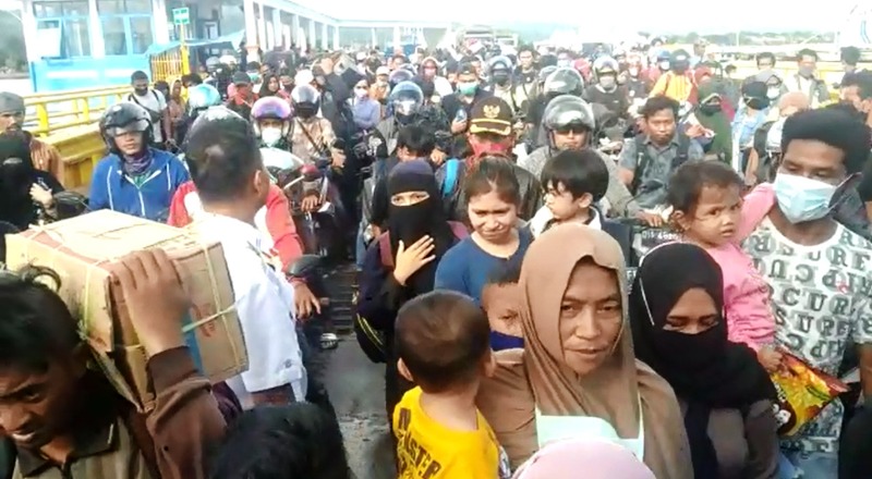 KOLAKA, TP – Ratusan pemudik di Kabupaten Kolaka, Sulawesi Tenggara (Sultra), Selasa, (4/5/2021), siang tadi memadati pelabuhan penyebrangan Ferry Kolaka – Bajoe. Para penumpang mengaku, memilih mudik lebih awal sebelum dilarang oleh pemerintah.