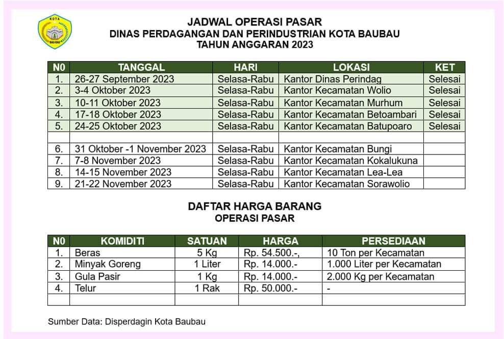 Data yang dikeluarkan Dinas Perdagangan dan Perindustrian menyebutkan operasi pasar ini menyasar seluruh wilayah Kecamatan di Kota Baubau, yang dilaksanakan rutin setiap hari Selasa dan Rabu sejak bulan September lalu, dan tahapan pertama ini dijadwalkan berakhir pada 22 November.