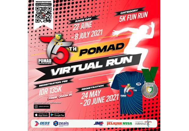 “Ayo daftar dan ikuti POMAD Virtual Run 2021. Sebarkan informasi ini ke saudara, teman, rekan kerja dan sahabat yang cinta dengan olah raga lari. Kapan lagi kita sehat dan bugar di masa pandemi ini, “ajak Letkol Indra