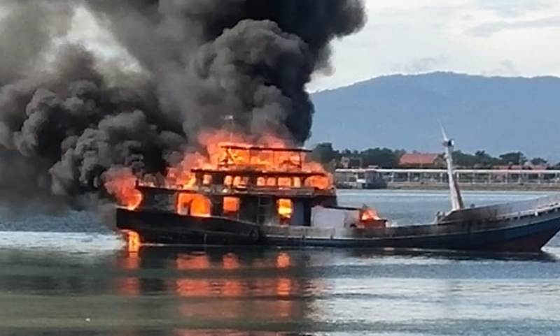 Sejumlah nelayan terlihat berusaha memadamkan api dengan peralatan seadanya, namun sama sekali tidak membuahkan hasil, sehingga api dengan cepat menghanguskan seluruh bagian kapal.