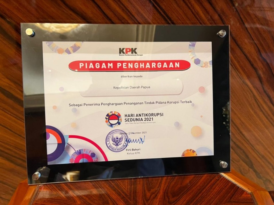 PAPUA, TRIASPOLITIKA.ID – Kepolisian Daerah Papua mendapat penghargaan dari Komisi Pemberantasan Korupsi (KPK) Republik Indonesia, Penghargaan tersebut diberikan KPK saat memperingati Hari Anti Korupsi Sedunia, Kamis (9/12/2021).