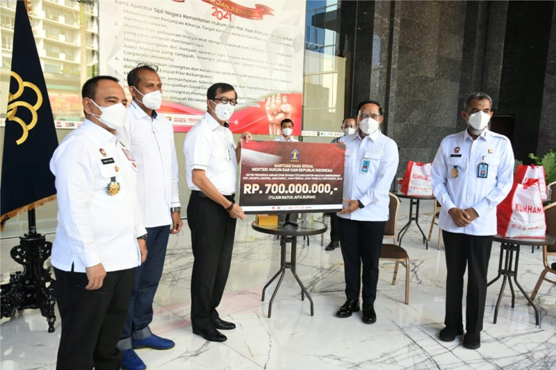 “Insan Pengayoman melalui program pemberian bantuan sosial “Kumham Peduli, Kumham Berbagi”, mencoba turut berempati kepada masyarakat dan ASN Kemenkumham yang terdampak pandemi Covid-19,” ujar Yasonna saat memberikan bantuan sosial secara simbolis, Kamis (29/07/2021) pagi.