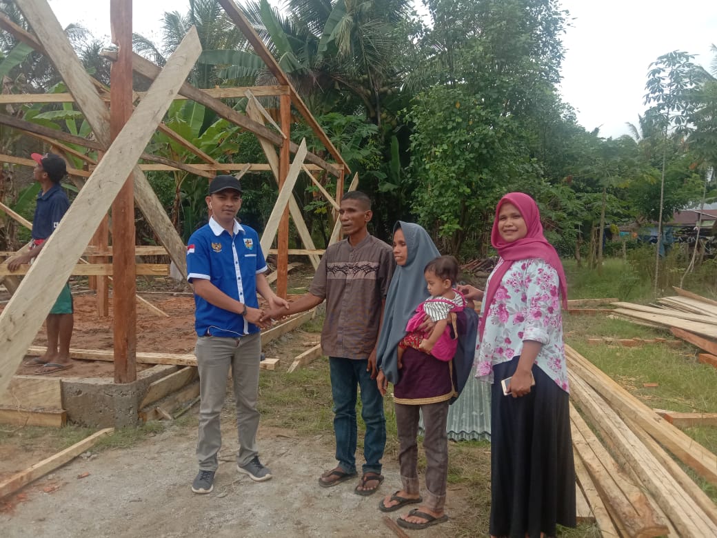 KNPI Mubar turun langsung memberi bantuan pembangunan rumah pasangan suami-istri tuna netra tersebut dengan memberikan bahan bangunan berupa atap (seng).