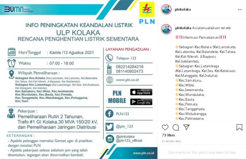 Informasi Pemadaman Sumber: instagram plnkolaka