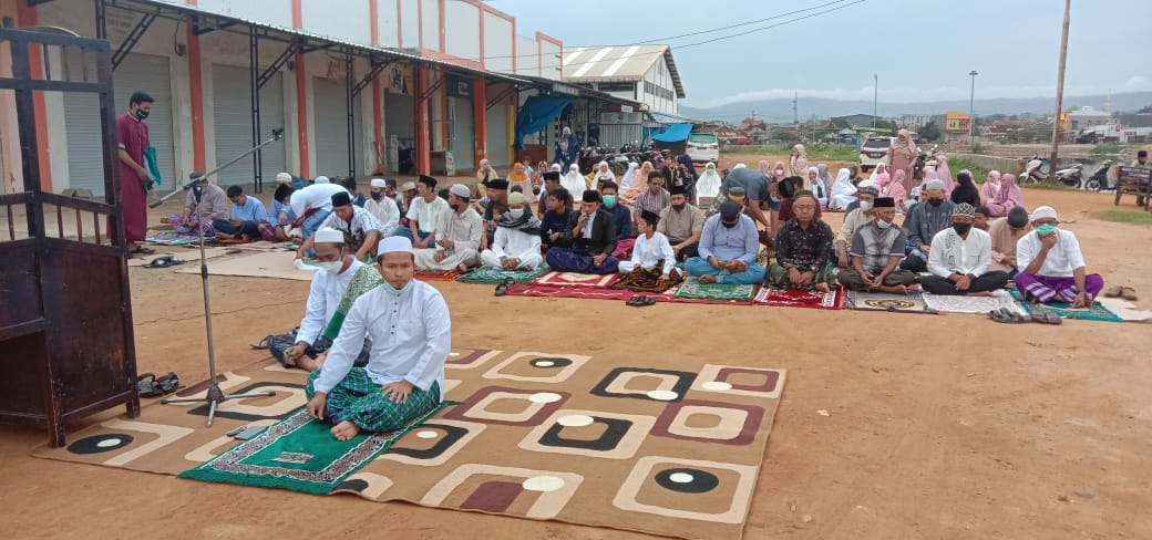 KOLAKA, TP – Ratusan warga serta pedagang yang berada di sekitar Pasar tradisional Bokeo Laduma, Kecamatan Pomalaa, Kabupaten Kolaka, Sulawesi Tenggara (Sultra), menggelar Salat Idul Adha di halaman pasar, Selasa, (20/7/2021).