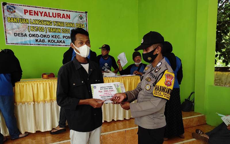 Pembagian BLT disaksikan anggota Polsek Pomalaa, Bripka Ismail Usman Daud yang juga Bhabinkamtibmas Desa Oko-oko.