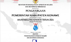 “Alhamdulillah, karena dukungan semua pihak sehingga Pemkab Konawe menerima penghargaan atas prestasi Sistem Akuntabilitas Kinerja Instansi Pemerintah (SAKIP) dan Reformasi Birokrasi (RB) Award tahun 2021 dengan nila B. Kita berharap kedepan bisa lebih baik lagi sehingga mewujudkan Visi Konawe Maju dan Mandiri tahun 2023 demi menyongsong Konawe Gemilang,” katanya.