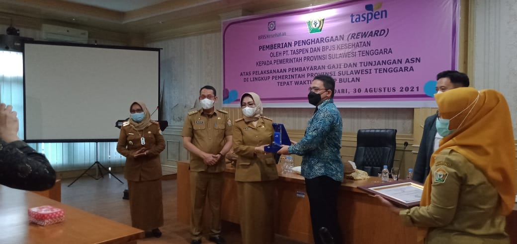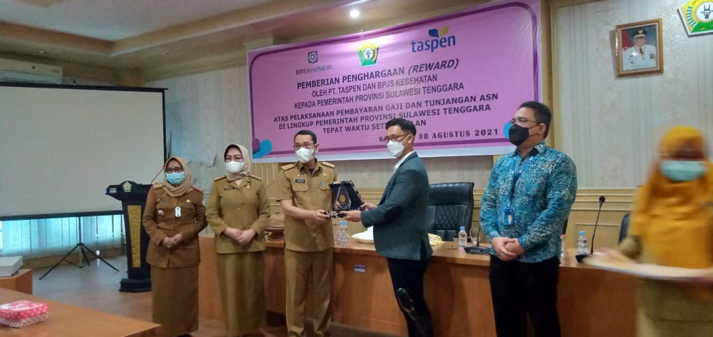 KENDARI, TP – Pemerintah Provinsi (Pemprov) Sulawesi Tenggara (Sultra) menerima penghargaan dari PT Taspen dan BPJS Kesehatan Cabang Kendari, Senin (30/8/2021).