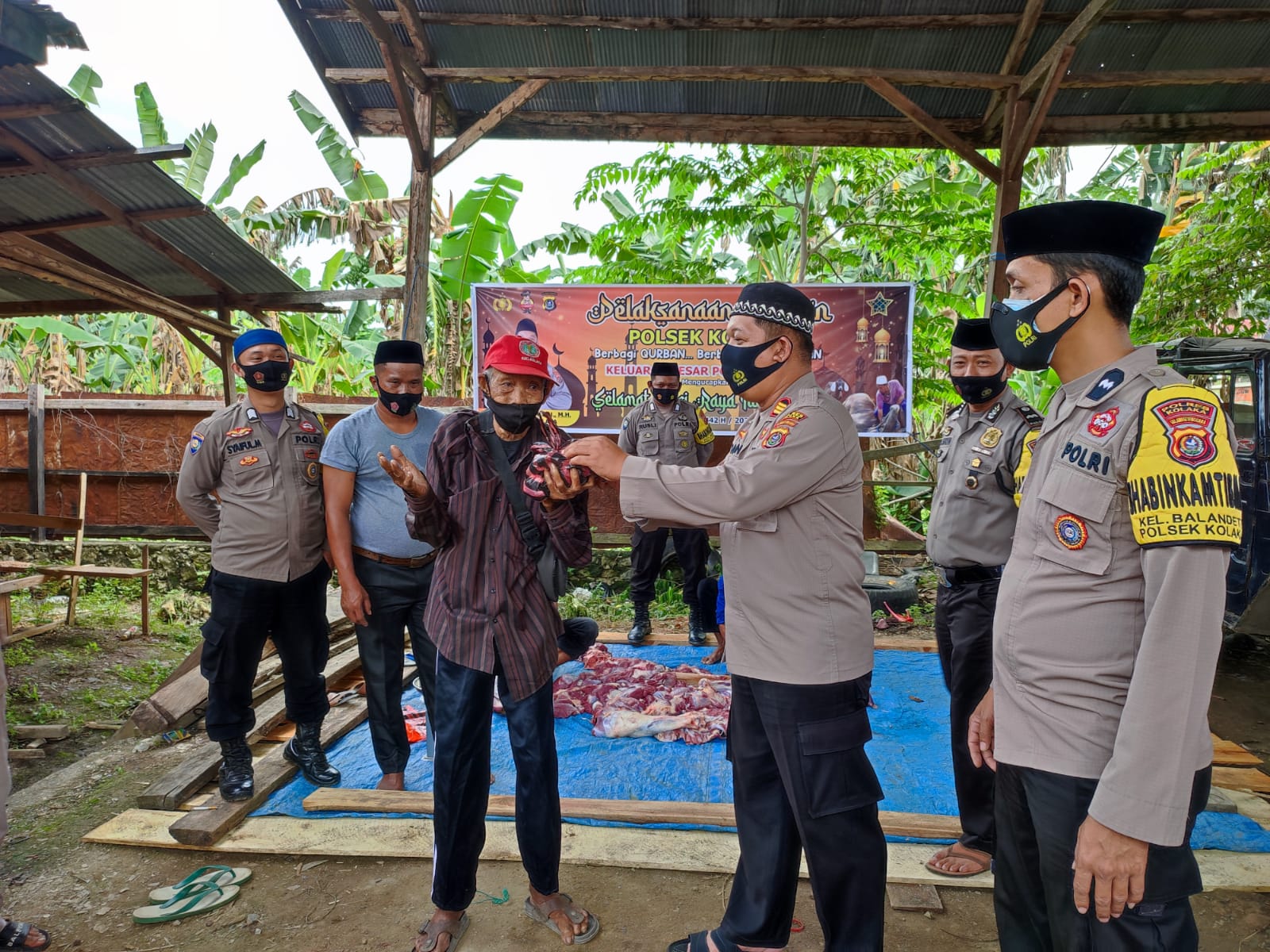 Kapolsek Kolaka AKP Muhammad Arman bagikan daging kurban secara simbolis ke warga terdampak pandemi Covid-19. Foto: A. Jamal/Triaspolitika.id