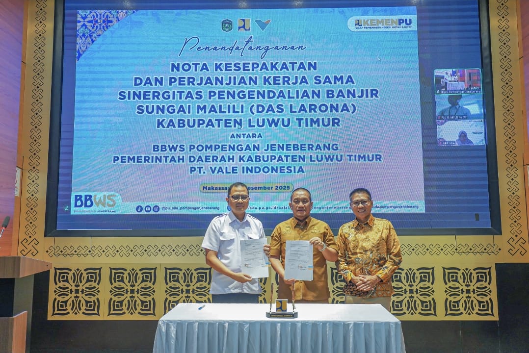 Penandatanganan kerja sama tersebut berlangsung di Kantor BBWS Pompengan Jeneberang, Kementerian Pekerjaan Umum dan Perumahan Rakyat (PUPR), Senin (29/12/2025). MoU ditandatangani oleh Bupati Luwu Timur Irwan Bachri Syam, Kepala BBWS Pompengan Jeneberang Heriantono Waluyadi, serta Wakil Presiden Direktur dan Chief Operation and Infrastructure Officer PT Vale Indonesia Abu Ashar.