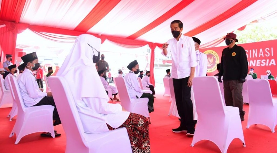 JAWA BARAT, TP – Presiden Joko Widodo menyapa para santri yang menjadi peserta vaksinasi Covid-19 di sejumlah pondok pesantren melalui konferensi video, dalam kunjungan kerjanya ke Pondok Pesantren Miftahul Falah, Kabupaten Kuningan, pada Selasa, 31 Agustus 2021. Dalam kesempatan tersebut, para santri menyampaikan harapannya kepada Presiden Jokowi setelah mendapatkan vaksinasi Covid-19.
