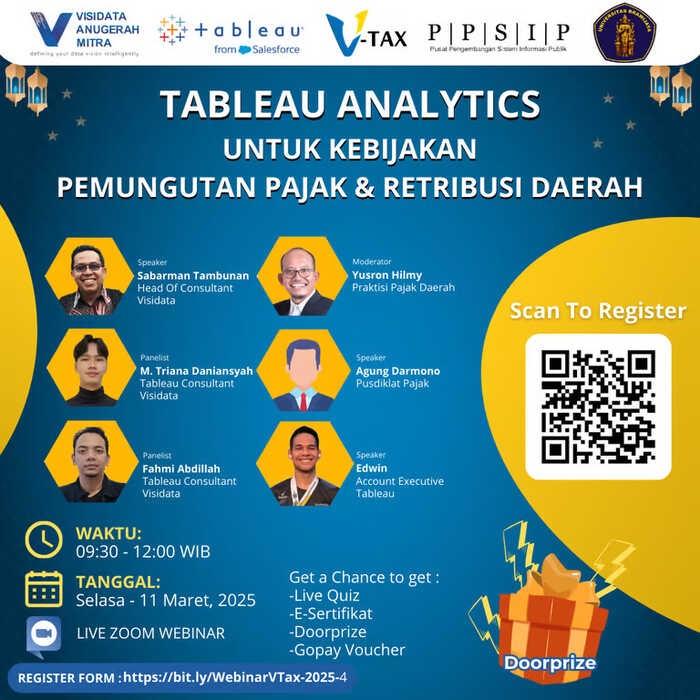 Dalam rangka mendukung transformasi digital di sektor pemerintahan daerah, Visidata, perusahaan penyedia jasa visualisasi data, akan menyelenggarakan seminar bertajuk “Tableau Analytics untuk Kebijakan Pemungutan Pajak & Retribusi Daerah”. Acara ini diadakan sebagai bentuk edukasi sekaligus sosialisasi penerapan teknologi analitik visual dalam meningkatkan efisiensi dan transparansi proses pemungutan pajak serta retribusi daerah.