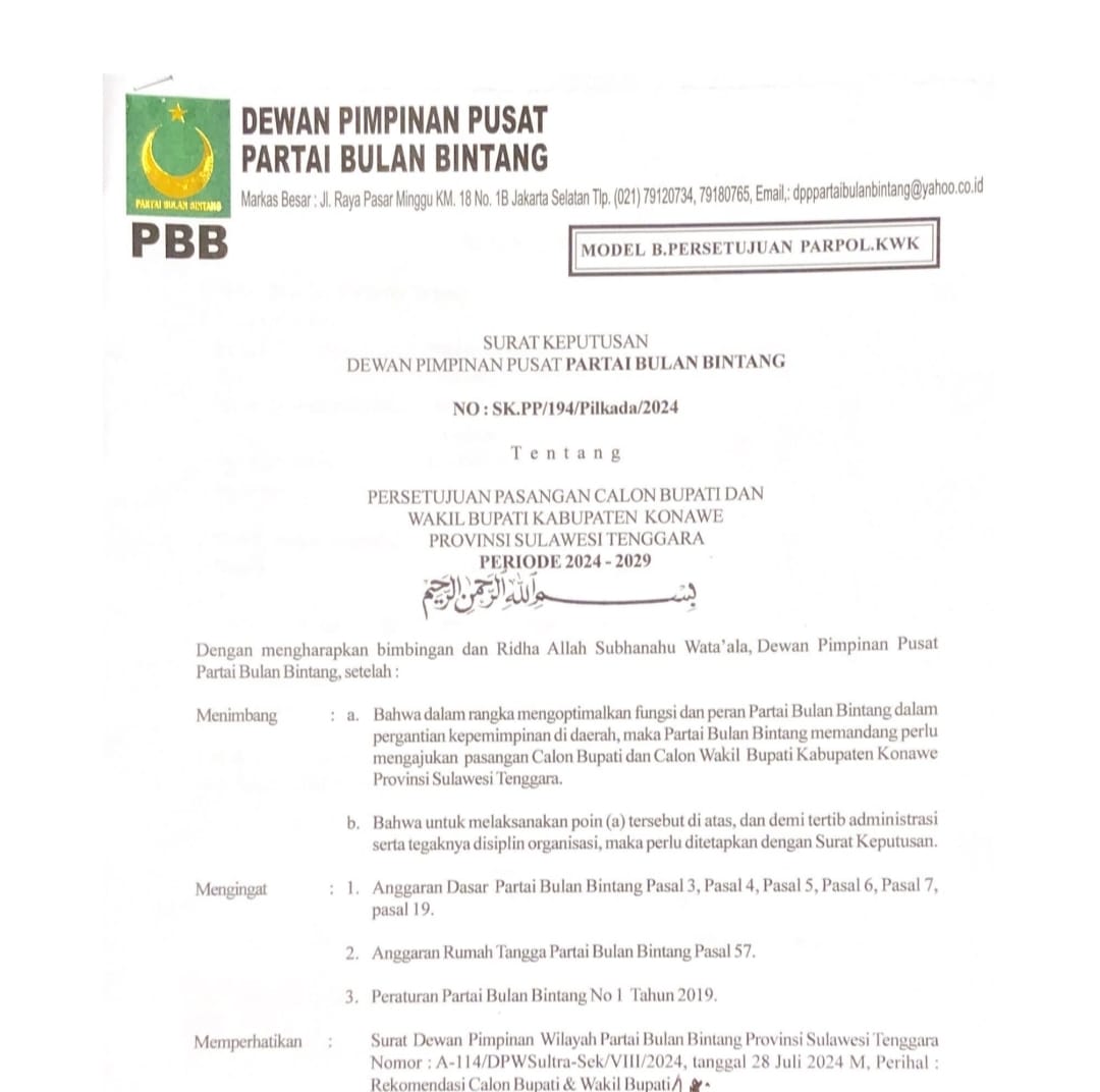 Hal itu dibuktikan dengan penyerahan rekomendasi B1KWK dengan nomor SK.PP/194/Pilkada/2024 yang rencananya bakal diserahkan di salah satu hotel di Unaaha pada, Rabu (28/8/2024).